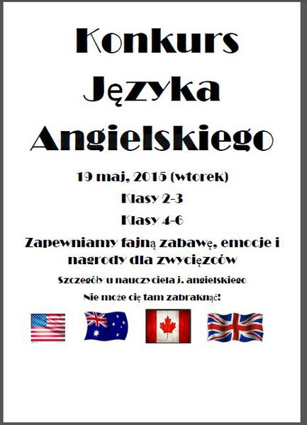 W dniu 19 maja 2015, w szkole został przeprowadzony konkurs języka angielskiego w dwóch kategoriach wiekowych, klasy IV - VI oraz II - III. Uczestnicy wykazywali się praktyczną znajomością języka angielskiego oraz wiedzą o krajach anlojęzycznych.