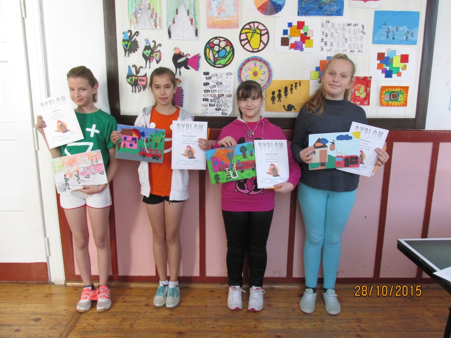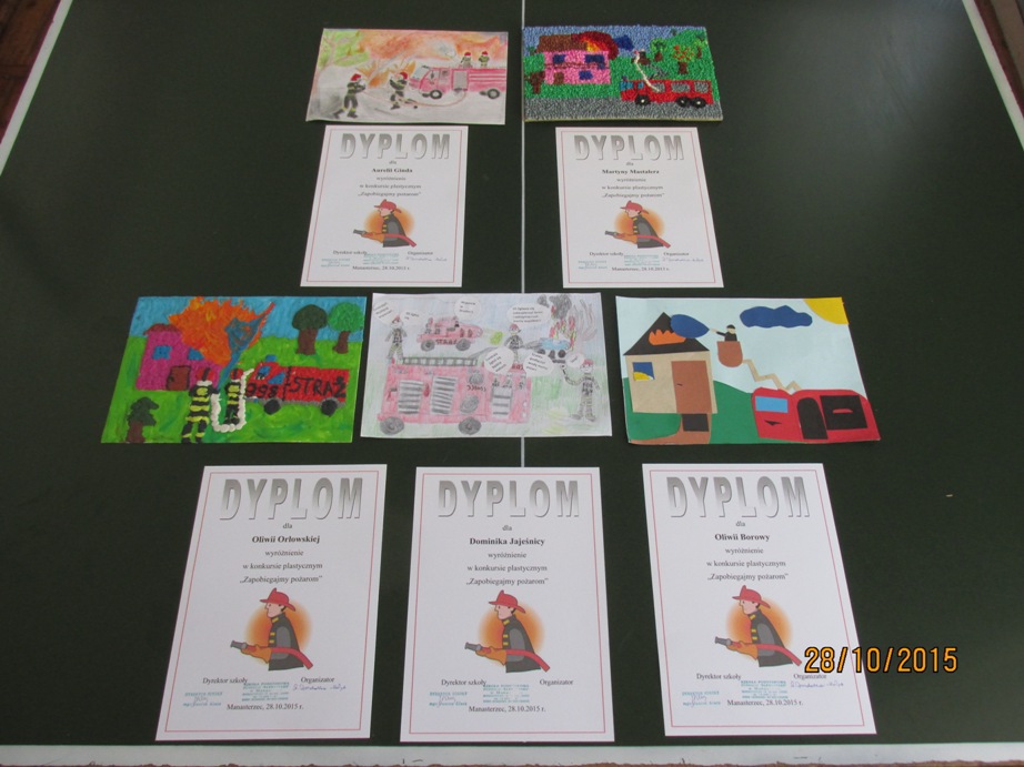 Podczas zajęć koła plastycznego uczniowie przygotowywali się do konkursu plastycznego „Zapobiegajmy pożarom”. Miał on na celu zainteresowanie dzieci ochroną przeciwpożarową oraz tradycją i życiem strażackich środowisk. Ostatecznie 28.10.2015 r. do konkursu przystąpiło 11 uczestników. Po burzliwych debatach Komisja wyłoniła 5 zwycięzców. Ich prace zostały zakwalifikowane do kolejnego etapu konkursu. Zwycięzcy otrzymali pamiątkowe dyplomy oraz symboliczne nagrody.