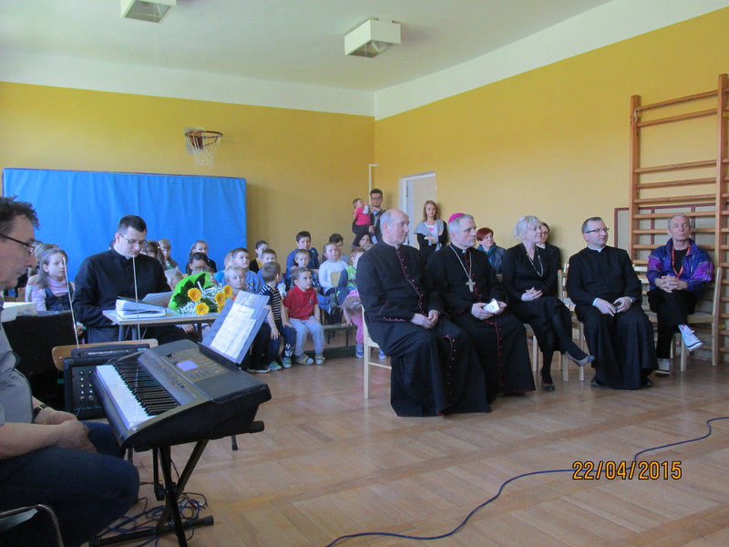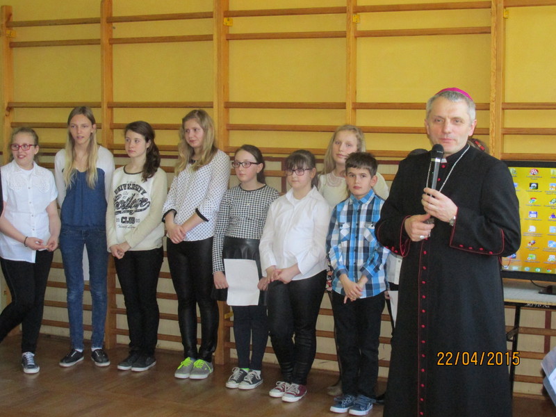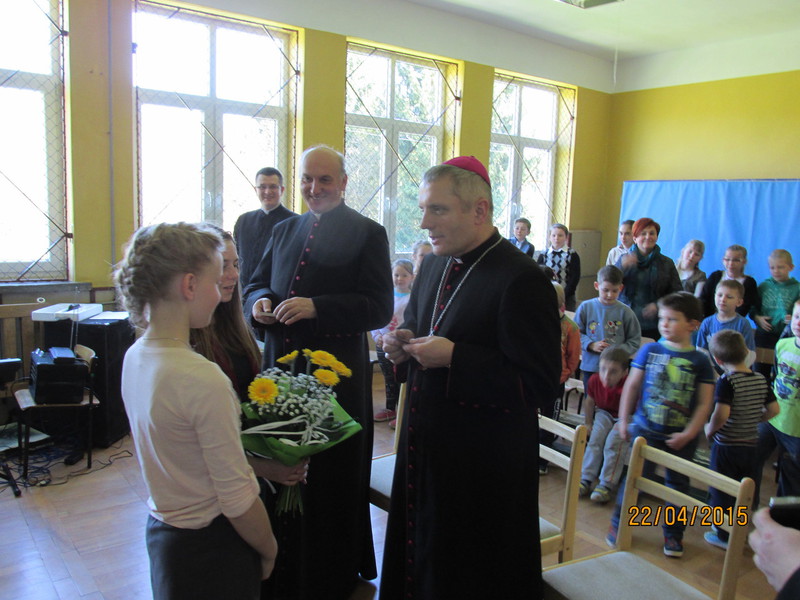 W dniu 22 kwietnia, 2015 gościliśmy w naszej szkole Biskupa Pomocniczego Archidiecezji Przemyskiej księdza Stanisława Jamrozka oraz Księdza Prałata Dziekana Dekanata Leskiego Mieczysława Bąka. Dzieci zaprezentowały krótką część artystyczną poświęconą papieżowi Ś.P.Janowi Pawłowi II.
