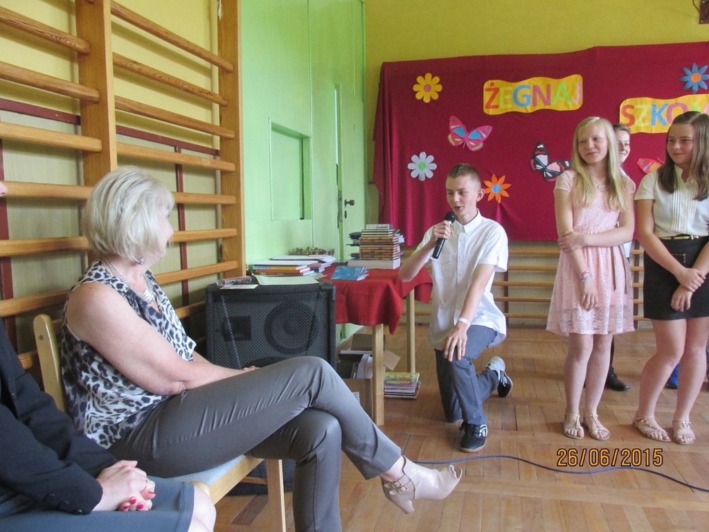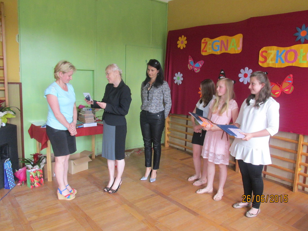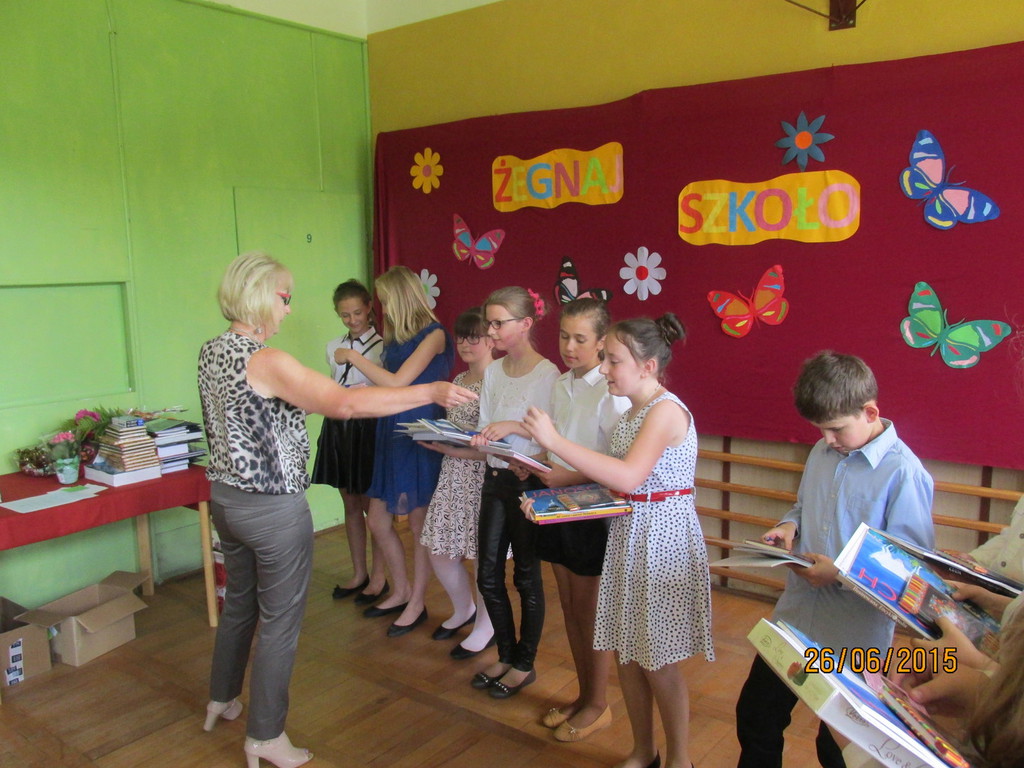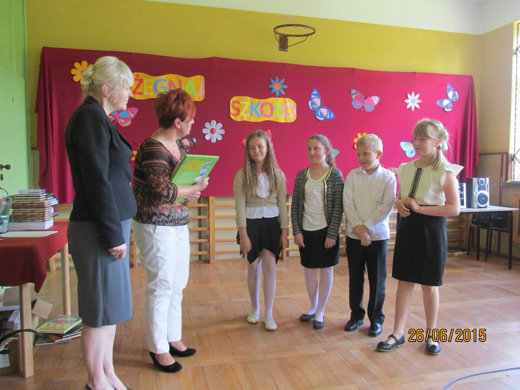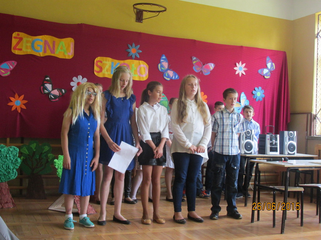 Uroczystość zakończenia roku szkolnego 2014/2015 rozpoczęła klasa piąta przedstawieniem przygotowanym specjalnie na pożegnanie swoich starszych kolegów. Dumni, z podniesioną wysoko głową ale również ze łzą w oku szóstoklasiści, pożegnali całą społeczność szkolną. Pani dyrektor Janina Klucz oraz wychowawca klasy pani Monika Drozdalska-Hołub wręczyły wszystkim uczniom świadectwa a tym, szczególnie wyróżniającym się nagrody książkowe, gratulacje oraz podziękowania dla rodziców.