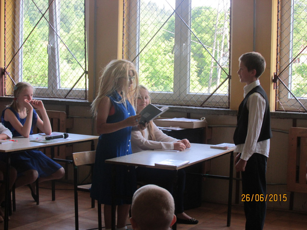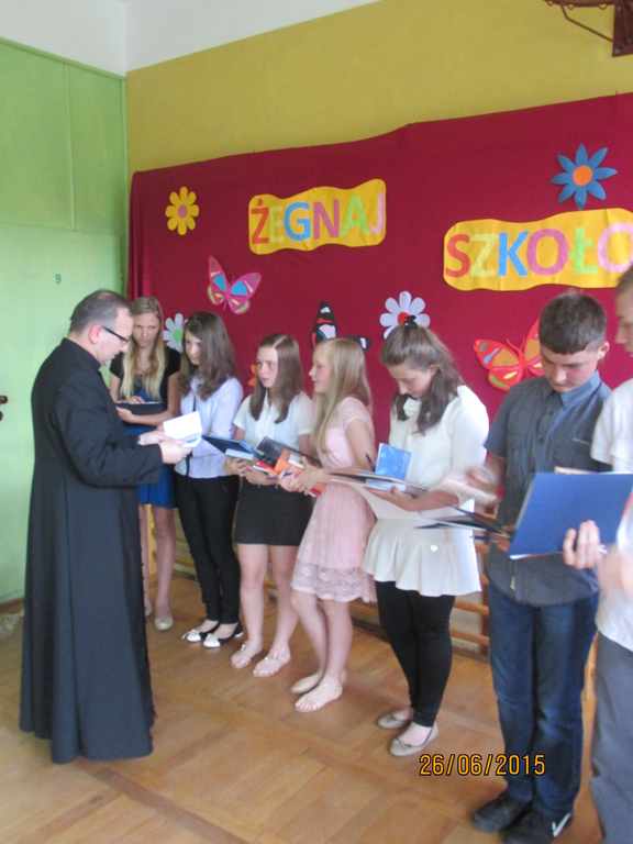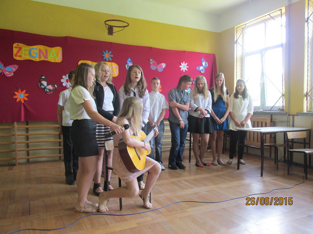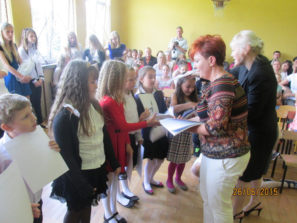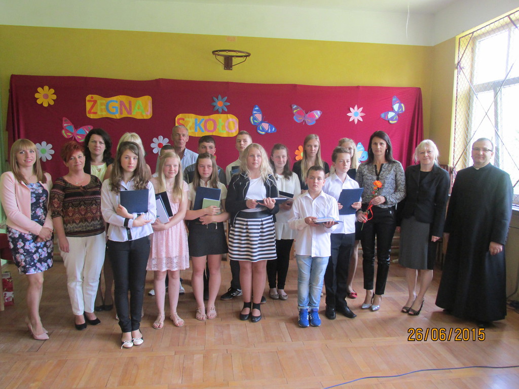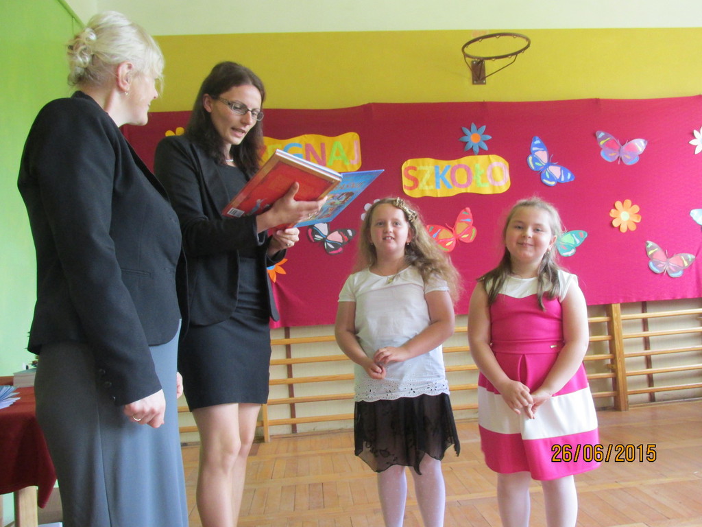 Uroczystość zakończenia roku szkolnego 2014/2015 rozpoczęła klasa piąta przedstawieniem przygotowanym specjalnie na pożegnanie swoich starszych kolegów. Dumni, z podniesioną wysoko głową ale również ze łzą w oku szóstoklasiści, pożegnali całą społeczność szkolną. Pani dyrektor Janina Klucz oraz wychowawca klasy pani Monika Drozdalska-Hołub wręczyły wszystkim uczniom świadectwa a tym, szczególnie wyróżniającym się nagrody książkowe, gratulacje oraz podziękowania dla rodziców.