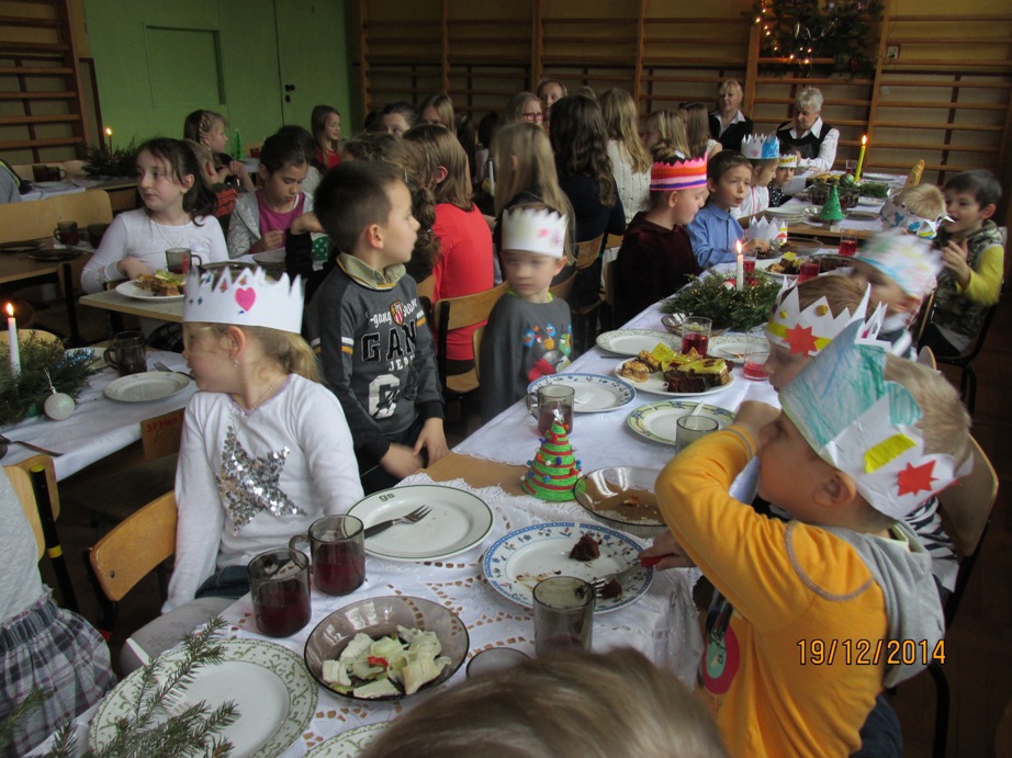 Przy odświętnie udekorowanych stołach wszyscy usiedli do spożycia wigilijnych potraw przygotowanych przez rodziców z naszej szkoły, za co serdecznie dziękujemy.