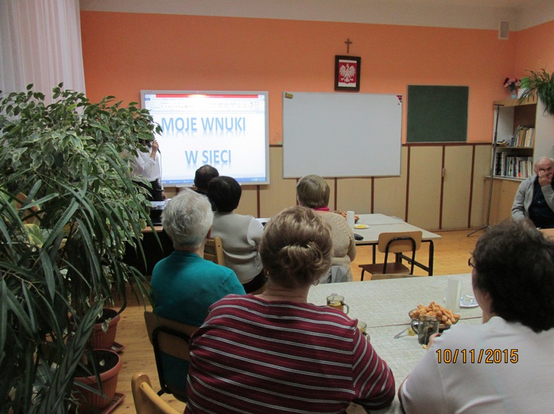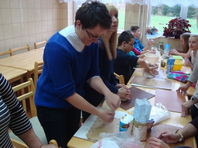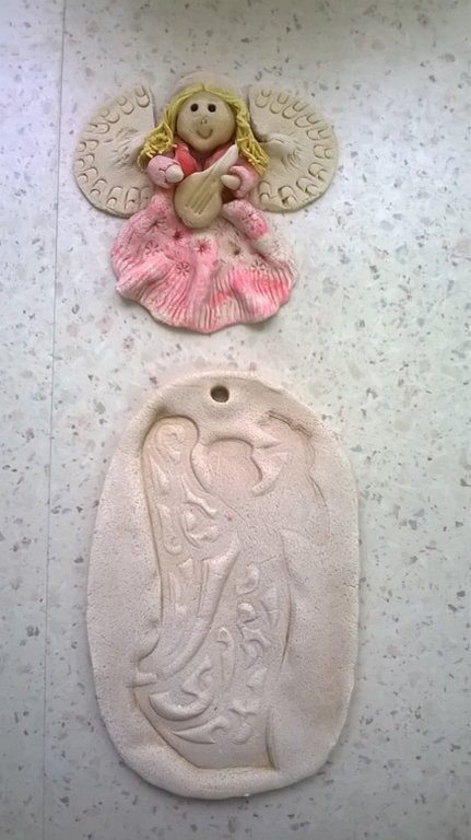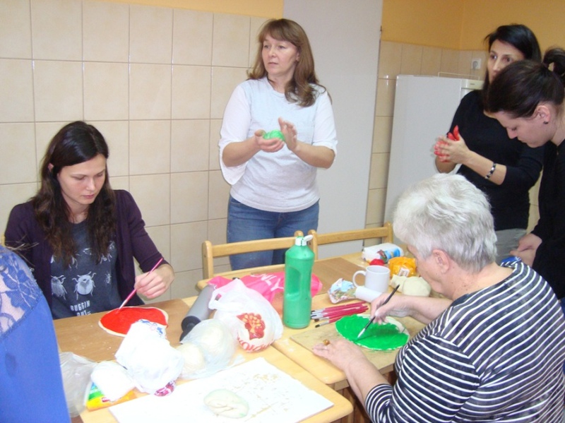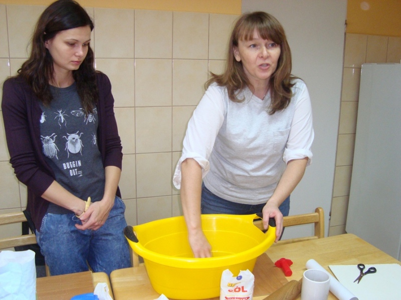 Współpraca rozpoczęła się ciekawymi warsztatami plastycznymi pod hasłem” Co można tworzyć z masy solnej”. Wspaniałe i interesujące zajęcia ciekawiły nie tylko dorosłych a przede wszystkim dzieci. Zanim przystąpiono do tworzenia, Pani Anna podała wypracowany przepis na masę solną; Szklankę soli rozpuszcza się w zimnej wodzie w proporcji 1:1 następnie wsypuje się tyle mąki ile zabierze płyn, po czym dokładnie wyrabia się masę jak ciasto, dotąd aż stanie się elastyczne. Prócz masy solnej do prac plastycznych potrzebne są różne elementy zebranych materiałów jak do śmieciosztuki tj klamerki, stemple z ciekawymi wzorami, szablony, nakrętki od flamastrów, farby, gałązki drzew iglastych, wyciskacze do czosnku i inne. Tak przygotowana masa solna i elementy służące do ozdób, pozwoliły na wykonywanie prac. Najpierw rozpoczęto wałkowanie części masy na placki średniej wielkości, następnie zamalowywano te placki farbą / temperą/ potem zwijano w rulon i w dalszym ciągu wyrabiano masę dłonią. Po tych przygotowaniach wszyscy uczestniczący w warsztatach tworzyli na specjalnych deseczkach różne medale, obrazki wykorzystując do tego przygotowane elementy ”śmieciosztuki”. Najwięcej radości wszystkim przyniosło tworzenie aniołków dużych i małych z kolorowymi sukienkami i długimi włosami. Aniołki pomagała dekorować Pani Anna, która od wielu lat uwielbia wykonywać anioły na specjalne zamówienia czy prezenty dla znajomych, bliższych i dalszych.
