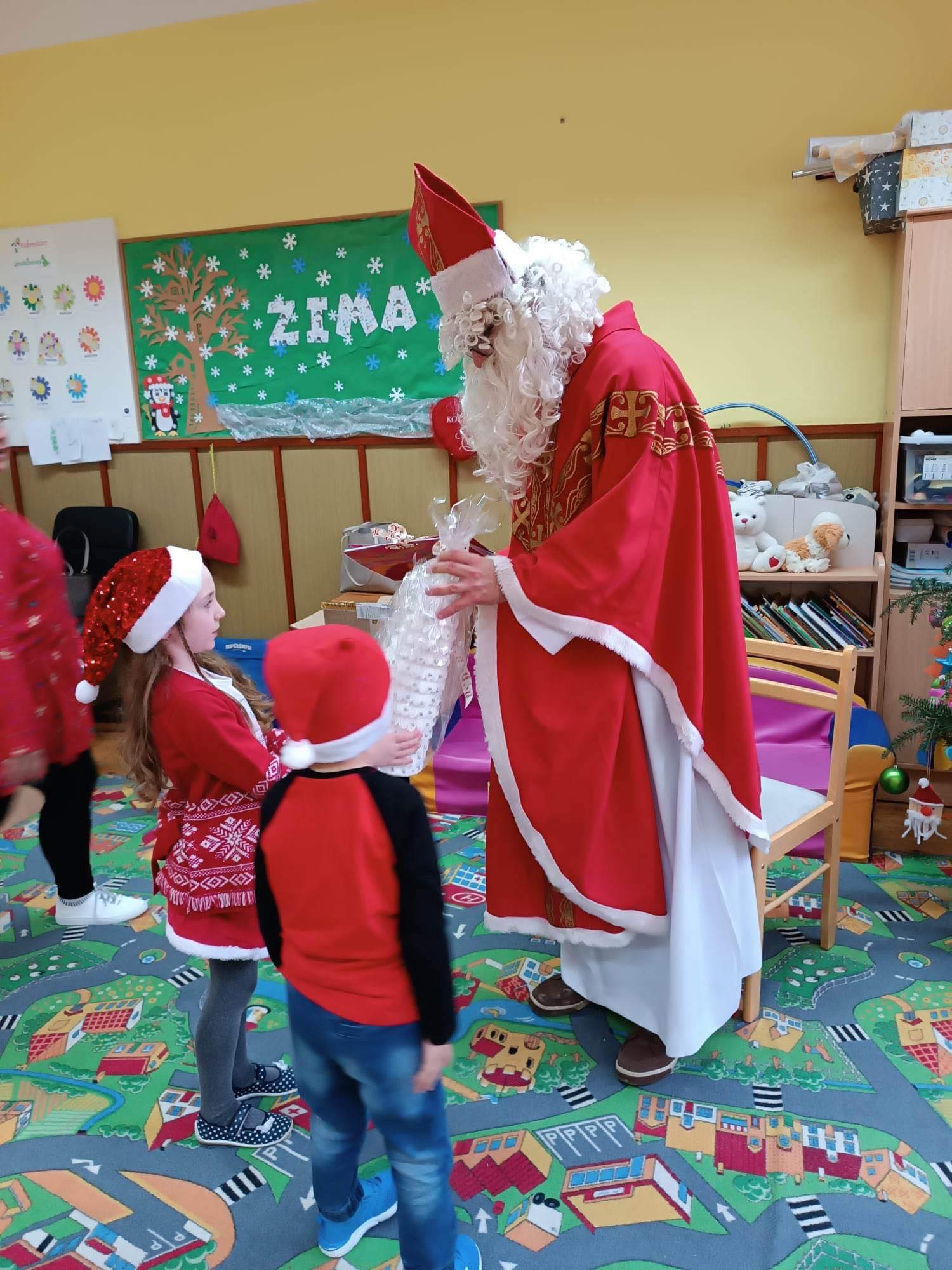W dniu 6 grudnia 2022 roku pojawił się długo oczekiwany gość, Święty Mikołaj. Pomimo braku śniegu o godzinie 12.00 odwiedził nas w szkole. Dzieci cierpliwie czekały na spotkanie. Uczniowie klasy I-III i przedszkolaki powitały Świętego Mikołaja wierszami, piosenkami i tańcami. Spotkanie z Mikołajem minęło w bardzo miłej atmosferze i przyniosło dzieciom wiele radości. Św. Mikołaj był tak zachwycony dobrocią i szczerością dzieci, że obdarował wszystkich uczniów prezentami. Mikołaj obiecał, że odwiedzi nas za rok, a my z pewnością będziemy czekać na jego wizytę.