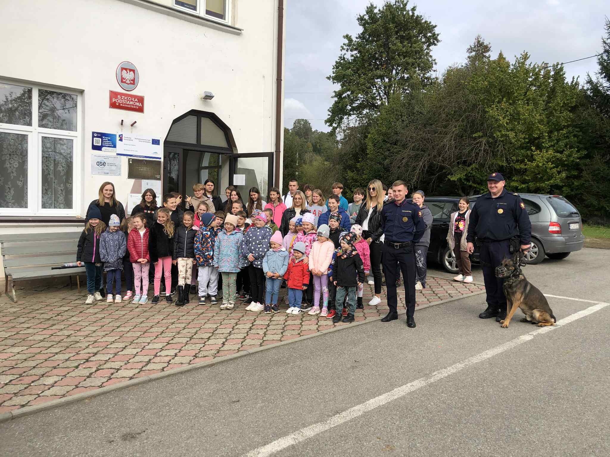 W pierwszej kolejności zaprezentowany został pokaz pracy psa służbowego, który wzbudził ogromne zainteresowanie uczniów. Dzieci obserwowały, jak zwierzę wykonuje zadania polecone mu przez przewodnika, a następnie zasypały naszych gości pytaniami. Funkcjonariusz wyjaśnił im, jak wygląda szkolenie takiego psa oraz opowiedział o istocie prawdziwej więzi między przewodnikiem a czworonogiem.